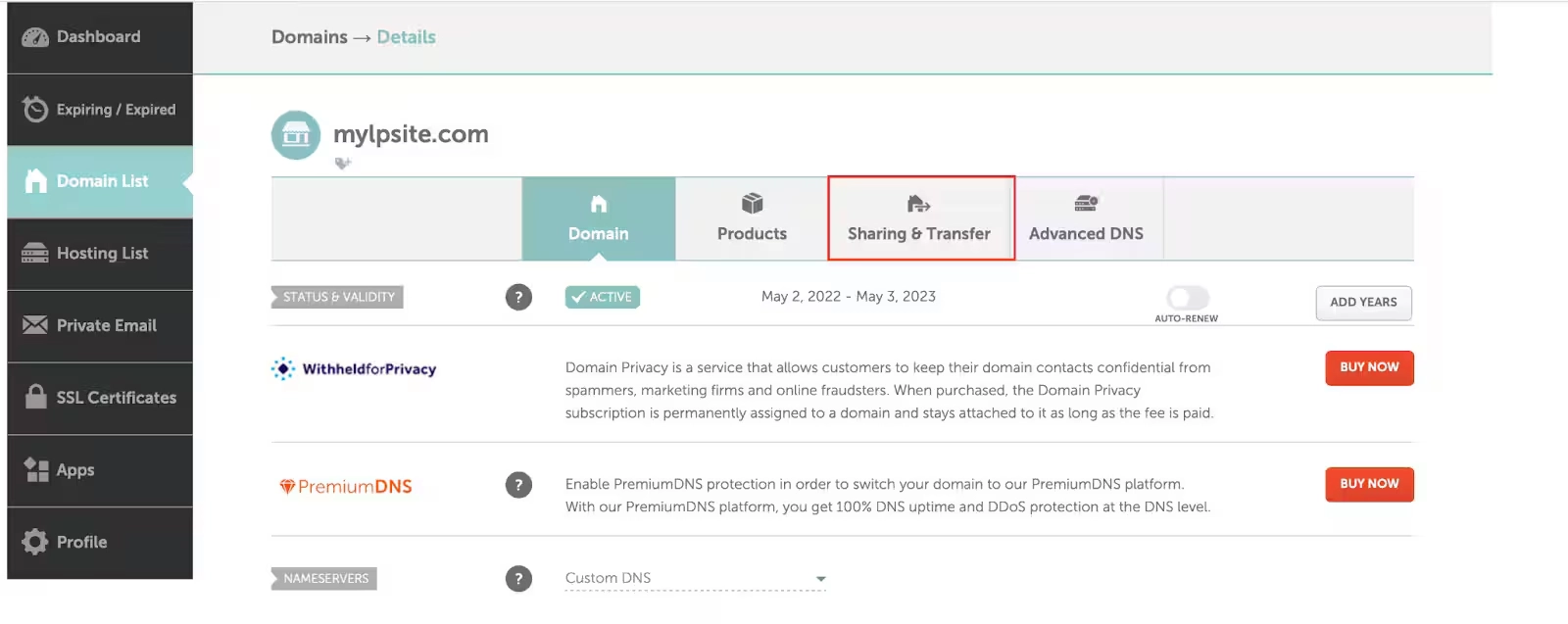 2. Select Domain List from the left sidebar and click on the Manage option in front of the domain name you would like to share access for: