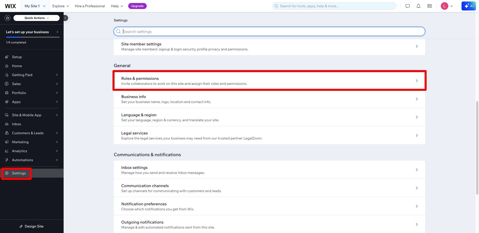 4. Choose Settings, then click Roles & Permissions:
