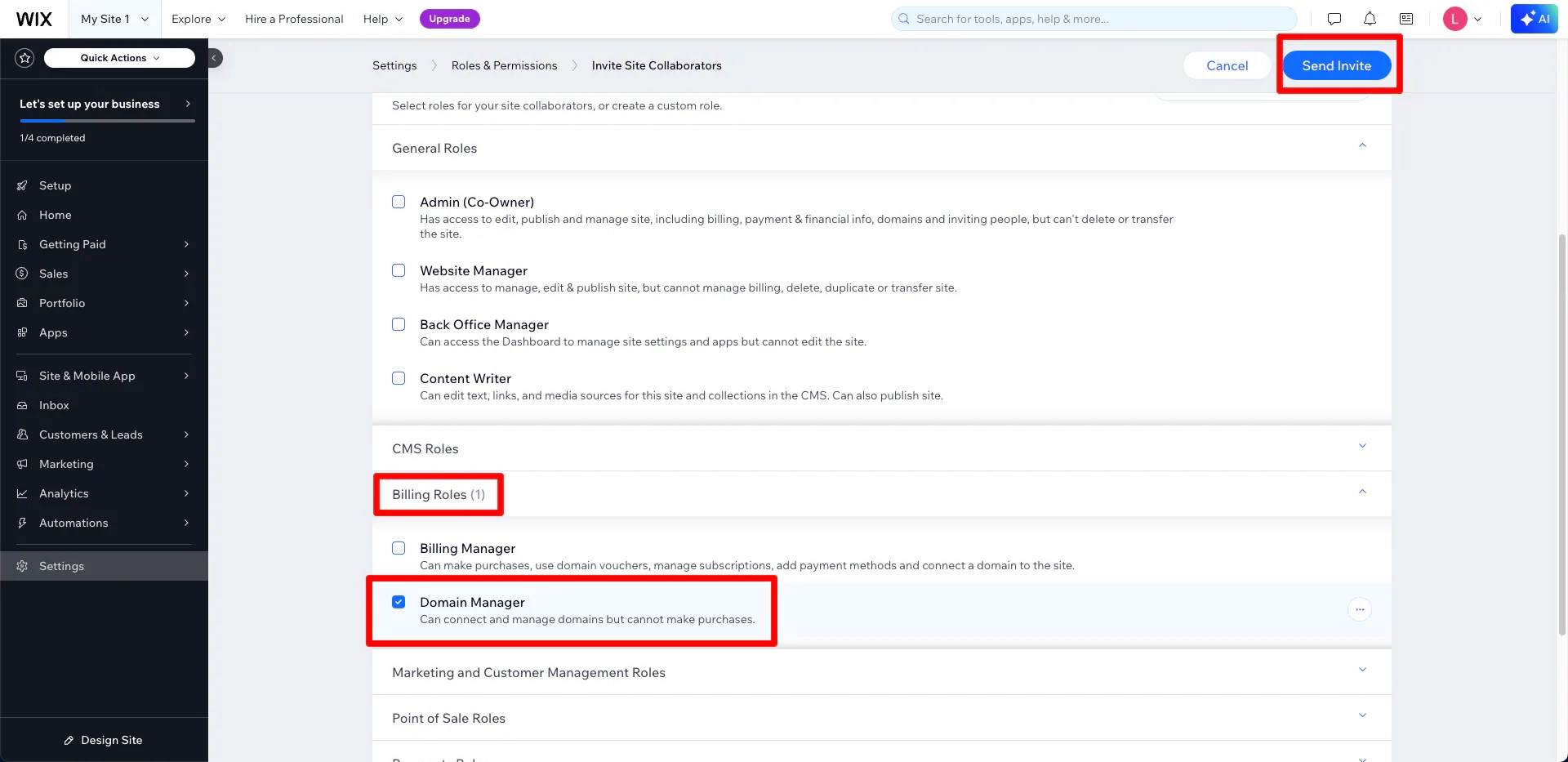 7. Under Billing Roles tab choose Domain Manager as the Role.